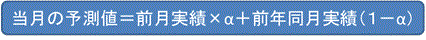 このモデルでは、前月実績にパラメータαを乗じた値に、前年同月実績に(1-α)を乗じた値を合算する。αが0.5より大きければ直近の需要動向を、0.5より小さければ前年同月をそれぞれ重視した予測値になる。前年同月の需要は季節変動が反映されているものと考えれば、この式は直近のトレンドと季節変動の2つの要素を加味したものといえる。