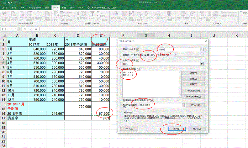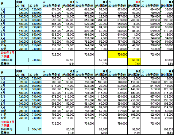 ここでは2017年の実績をもとに、0.1から0.9までのαを使って(すでに答えの出ている)2018年の予測を行う。最適なαを求めるための試行錯誤を行うわけである。2018年の実績はすでに確定しているので、この方法によりそれぞれのαに対応した予測値と実績の差が求められる。