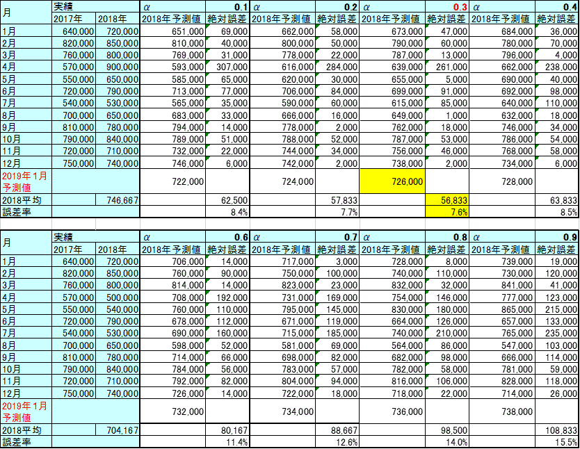こうして算出した各絶対誤差の月平均と2018年実績の月平均を比較して誤差率を求める。誤差率が最も小さいパラメータαが最適なパラメータということになる。表ではα=0.3のとき、絶対誤差の平均が56,833、誤差率7.6%で最小、つまり最適なパラメータとなった。このα=0.3を先の算出式に入れて2019年1月の予測を行えば、おおよそ7%内外の誤差率で的中するはず、と仮定するわけである。