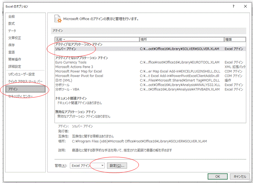 通常、ソルバー機能はEXCELに備わっているのだが、まずは「アドイン」して機能を有効化する必要がある。
