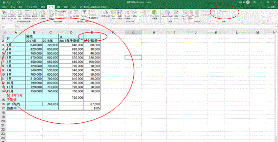 ②先の2017年、2018年の実績と予測を求める式を挿入した表を作成し、データメニューの「ソルバー」をクリックする(図表3)。αの値はE1のセルとなるがこの段階では何も入れないでおく。予測値はαがゼロで計算されるので、この時点ではすべて前年同月実績となる。