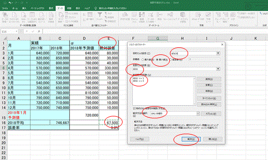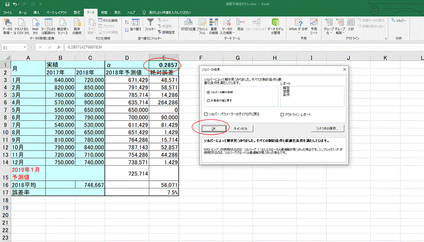 手作業による試算では0.3であったパラメータがソルバーにより0.2857と、より正確な値となった。その結果、誤差率は7.6%から7.5%に縮小し、予測値は726,000から725,714と精緻化された。