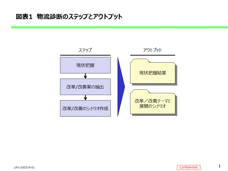 物流診断は、「現状把握」「改革/改善案の抽出」「改革/改善のシナリオ作成」3つのステップで進めます。この流れは、一般的な改善活動と変わりありません。この検討結果のアウトプットは、「現状把握結果」と「改革/改善テーマと展開のシナリオ」の2つです。「現状把握結果」は現状の事実を整理したもので、自社物流の全体像が分かるものですから、更新して行けば以降も活用できるものです。「改革/改善テーマと展開のシナリオ」は検討の結果をまとめたものです。自社もしくは委託先と改革/改善活動を進めていくための台本となるものです。