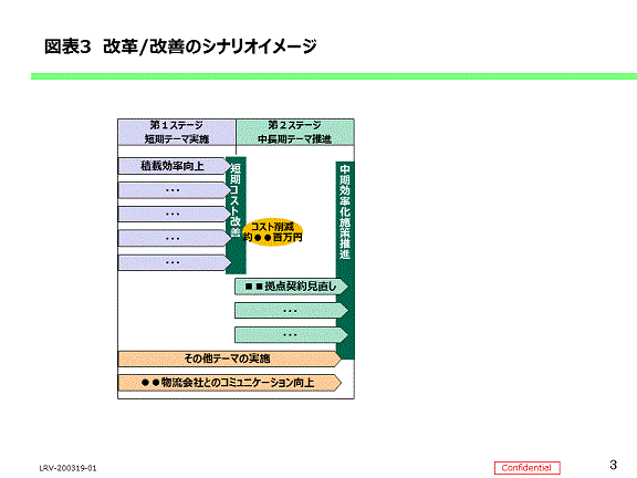 この案は、生産にかかわることでなかなか実現のためのハードルは高いですが、物流を効率化するためには、生産を変えて考えてみるという事例です。このように、物流を中心に、生産や販売もあわせて考えて、改革/改善テーマを考えていくことが必要です。