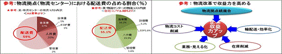 物流拠点の売上高物流コスト比率をみると配送費の割合が半分(50%)以上と大きなウェートを占め、この配送コストが物流コスト全体の課題と考えています。