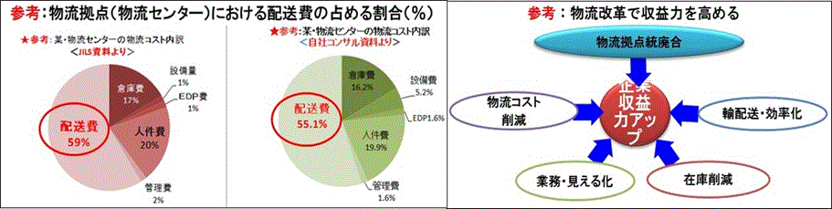 さらに、荷主・顧客の生産性を向上させることにより、将来の労働力不足を克服、経済成長に貢献していくことにつながると考えます。そこで、荷主同志の協調でトラック積載率の改革、物流拠点の業務を「成長を加速する物流」にシフトしていかなければ、物流業界の先々の成長はありません。さらに、移動時間・待ち時間、スペースなどの物流の様々なムダを効率化し、生産性向上の在り方などの従来に捉われていない改善に着眼し、日本の産業と経済の成長を加速させたいものです。最近の物流業界の動きとして、抜本的なコスト削減の追求策の一つになるであろう物流拠点の配置、集約化、分散化が注目され、取り組みの強化が活発化してきています。また、物流拠点の統廃合により、配送コストの最適化を図るためメイン納品先の周辺に物流拠点を配置、走行距離や配送時間の合理化の模索も始まっています。物流拠点の新設、統廃合などでも1回の輸送量を大きくしたり、コースの集約化、輸送手段の変更で物流拠点から顧客までの走行距離や時間、配送コースの改善で積載率の向上、トラック台数の削減など、大幅なコストを抑えることに注力し始めています。さらに、配送コストの検討を行う中で、物流拠点の新設、統廃合、在庫の統合、物流拠点の分散に取り組み、投資対効果の見極めが重要になってきています。また、複数拠点配送を実現している企業が最近増えてきているように見受けます。複数拠点配送にすると在庫の分散(在庫増)が生じますが、配送費用を更に抑えることで配送スピードの向上とCS(顧客満足度)を高めることが可能になります。それぞれの企業事情により複数拠点を必要とした場合、物流拠点の最終工程である配送計画は、出荷管理と連動した業務効率化を重視した取り組みを考えていきたいものです。