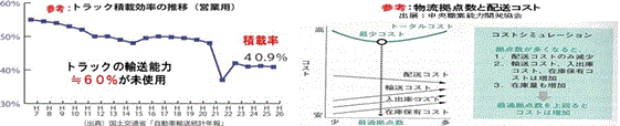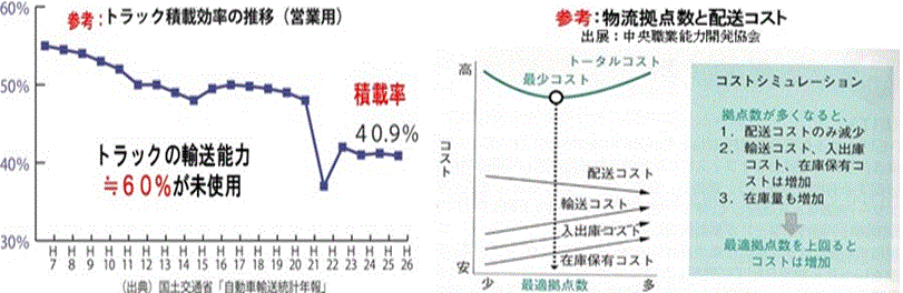行政(国土交通省)の資料によりますと近年の我が国の物流は、トラック積載率が41%で様々な非効率が発生しているとのことです。