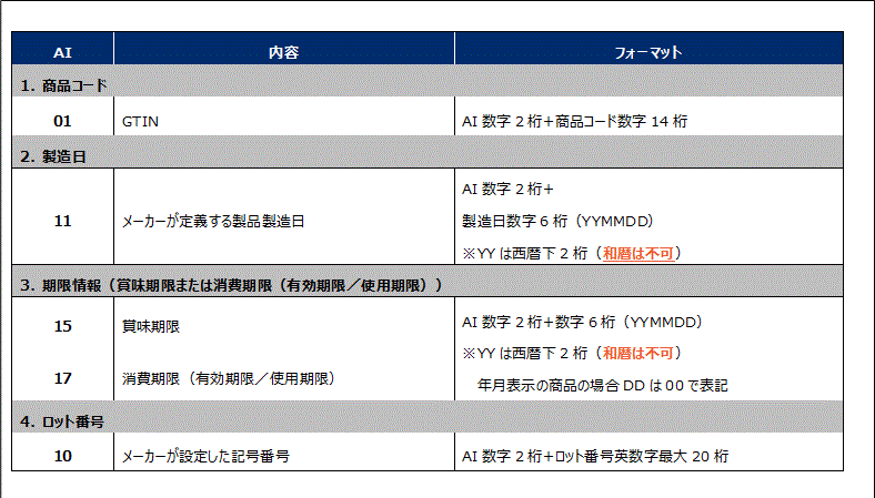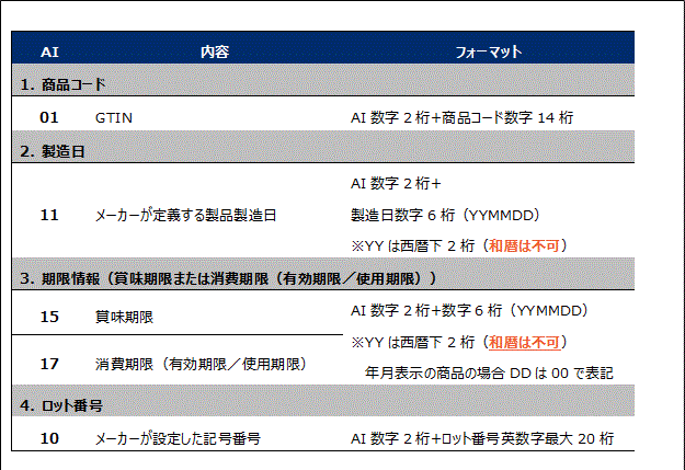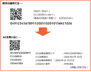 バーコードに表示する項目は、商品コード(GTIN)、製造日、賞味期限・有効期限などの「期限情報」、ロット番号の4つです。こうした複数の情報をバーコード表示するには、GS1アプリケーション識別子(GS1 Application Identifier: AI)と使って情報を表します。GS1アプリケーション識別子は、データの先頭につける2桁から4桁の数字で、データの種類を表します。またデータの長さ(桁数・文字数)や使用可能な文字等が定められています。国際的に定められたルールにしたがってバーコード表示することで、どの国のどの企業との間でも共通の方式で、データをやり取りすることが可能になります。また、バーコードデータの中から、GS1アプリケーション識別子を基に、自社に必要な情報のみを取り出すことができます。