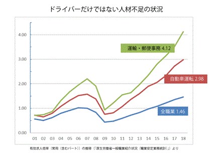 少々古いデータであるが、図表2の有効求人倍率(2018年)では、「自動車運転」の倍率が2.98に対して、「運輸・郵便事務」が4.12と4割近く高い。ドライバーより事務スタッフの人手不足ははるかに深刻なのである。