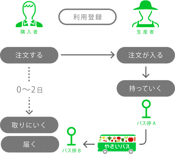 集荷した野菜は、レストランやスーパーなどの最寄りの「バス停B」まで運ばれ、それぞれの店の人が「バス停に取りにいく」という、「地産地消」のビジネスモデルである。