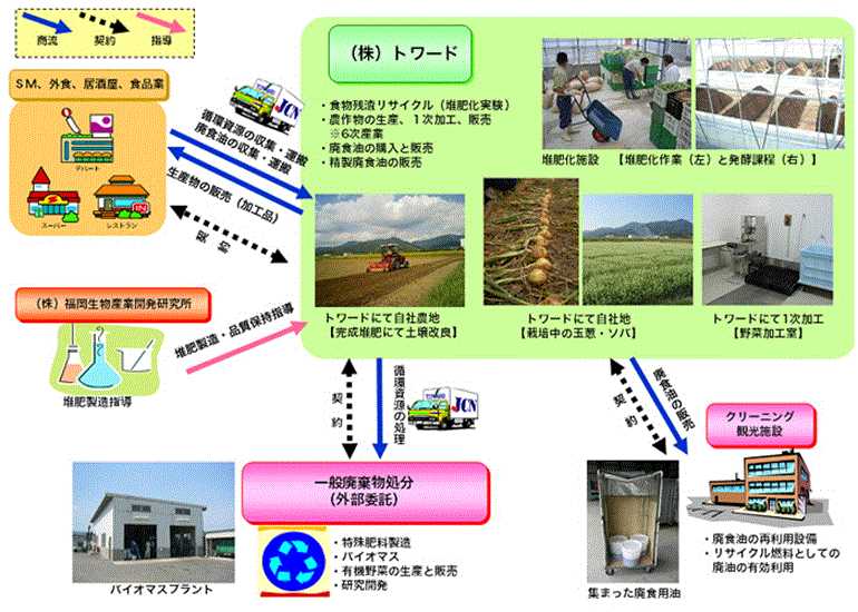 同社ホームページによれば、「物流」と「農業」それぞれ異なるユニットを融合させた事業で、同社の物流網を活かし、顧客の店舗から排出される食物残渣や廃油を専用の容器で回収し、食物残渣は農産物の堆肥として、 廃油はボイラー燃料としてそれぞれ有効活用できるリサイクルループを構築している。