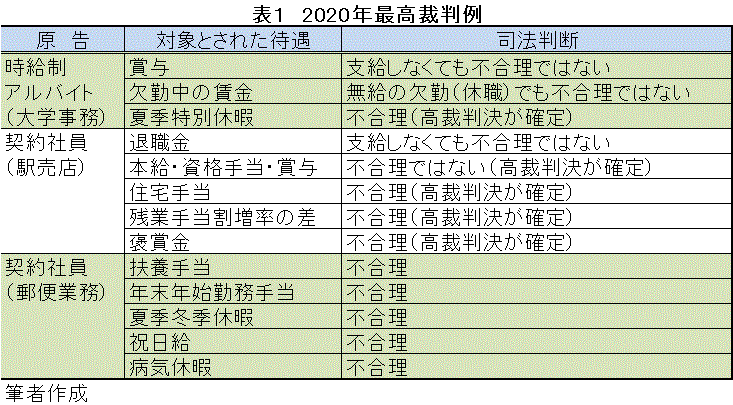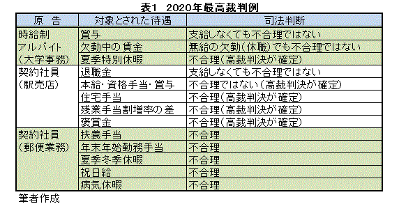 表1は、5事件の「2020年最高裁判例」を取りまとめたものである。日本郵便事件は、大阪・佐賀・東京の3事件をまとめて記した。