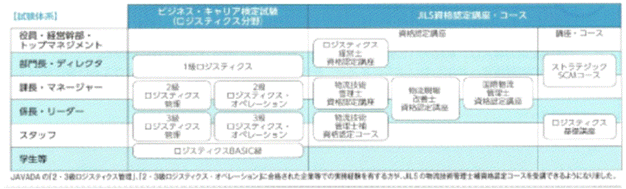 具体的には、JAVADAのロジスティクス(管理・オペレーション)の3級取得者はJILSの物流技術管理士補資格認定コースを、2級取得者は物流技術管理士資格認定講座を、1級取得者はロジスティクス経営士資格認定講座を割引料金で受講できるというものである。