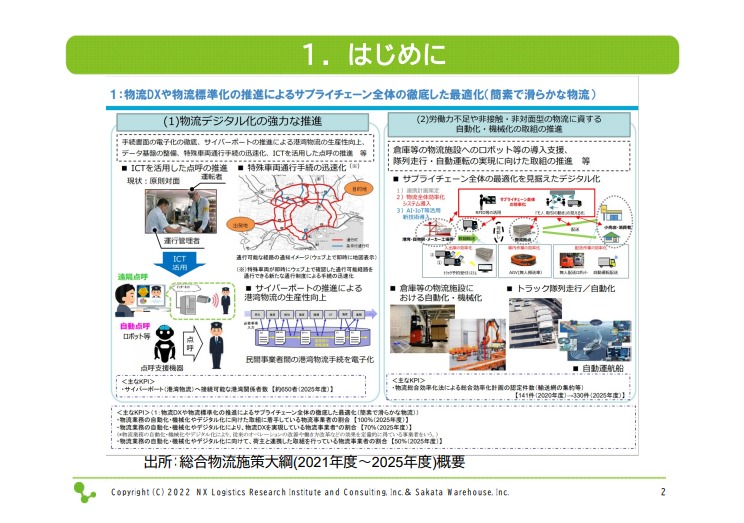 資料には、「サプライチェーン全体を見据えたデジタル化をしていく」という図表がありますが、デジタル化は手段です。例えばサカタウエアハウスさんの倉庫の中で自動化・機械化をしている、あるいはトラックの隊列走行により自動化している、これらは手段なのです。