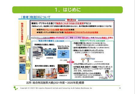 先ず物流DX(DX:デジタル・トランスフォーメーション)ですが、DXが目的ではありません。倉庫の中を自動化しようとか、省力化しようとか、あるいはドローンを飛ばそうとか、自動運転をしようとかそういったことが目的ではないのです。DXは、それを通じて何か他のことをするための手段です。