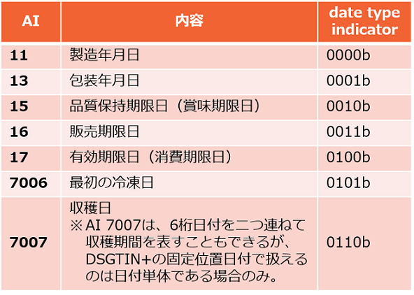 実際の例を見てみよう。図 16は、図 7で示したSGTINの例に有効期限(GS1アプリケーション識別子17)を加えて、DSGTIN+エンコード方式を用いてエンコードした例である。DSGTIN+エンコード方式は、SGTIN+エンコード方式と区別するためにヘッダ値が異なることと、GTINをエンコードしている部分の手前に日付情報を格納するための20bitの空間が固定的にあることを除いては、SGTIN+エンコード方式と変わらない。この位置が固定された20bitの空間には、図 17に示す6桁日付の情報を一つだけ格納することができる。先頭4bitにその日付情報の種類を示すdate type indicator(図 17に示す通り、GS1アプリケーション識別子に対応して、それとは別に4bitの値が決められている)を置き、残り16bitの空間に日付情報そのものを置く。これにより、EPCメモリバンク上の決まった位置に日付情報をおくことができるので、これを基に無線通信上での電子タグの読み分けが可能である。尚、DSGTIN+エンコード方式もEPC+エンコード方式の一種であるので、先述の+AIDC dataエンコード方式を組み合わせて任意のその他属性情報をエンコードすることもできる。DSGTIN+の日付情報のための固定位置には一つの日付情報しか入れることができないので、複数種類の日付情報を電子タグに持たせる際にDSGTIN+を用いるならば、そのうち無線通信上での読み分けに用いる一つのみを固定位置に格納し、残りは+AIDC dataエンコード方式で扱う(=無線通信上での読み分けには利用できない)ということになる。