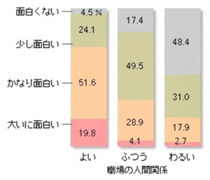 例えばこんな事例が私のごく周辺で起きます。すぐ右前に座っている上司が嫌で嫌でたまらなくて部下はついに右方向に首が回らなくなった。いくら整骨院、外科に行っても治らない。ついに会社に行けなくなってしまった、そうするととたんに治癒した……あくまでn=1の事例ですがよく聞く話です。このような事態は今までのマネジメントの範囲外ですので実際に重い症状になるまでは議論になりにくいですね。下の図はNTTデータで調べられたものですが(注1)人間関係が仕事の面白みという意欲に強く影響することを現しています。職場の人間関係がよいと大いに面白い、かなり面白いという意見が7割にもなりますが、一方人間関係がよくない場だと3割しかないというのですね。