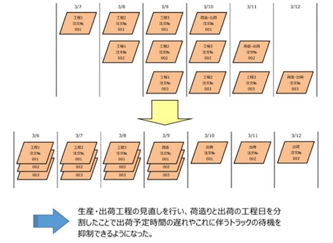S社では、生産管理も巻き込んで製造オーダーをロツト化し、荷揃えと出荷の工程を分割するとともに、社内のリードタイムを1日延長して、出荷前日までに荷揃えできるよう改善し、出荷予定時間や出荷納期の遅れが減少した。