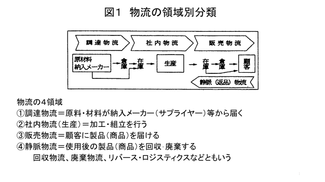 図1では加工・組立を行うメーカー、即ち「製造業」を例示しているが、卸売業・小売業の「流通業」でも同様に、商品の仕入れに伴う物流が調達物流(procurement physical distribution)に相当する。