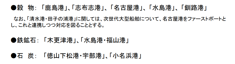 なお、国際バルク戦略港湾の目標年次(2020年)を過ぎた現時点では、「釧路港」「徳山下松港・宇部港」「小名浜港」が整備されている。