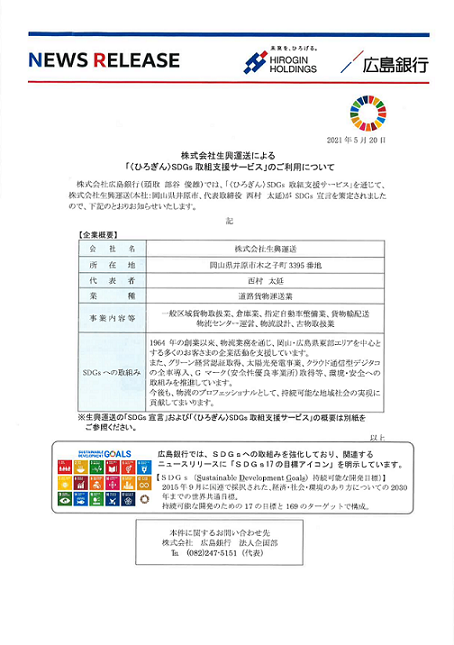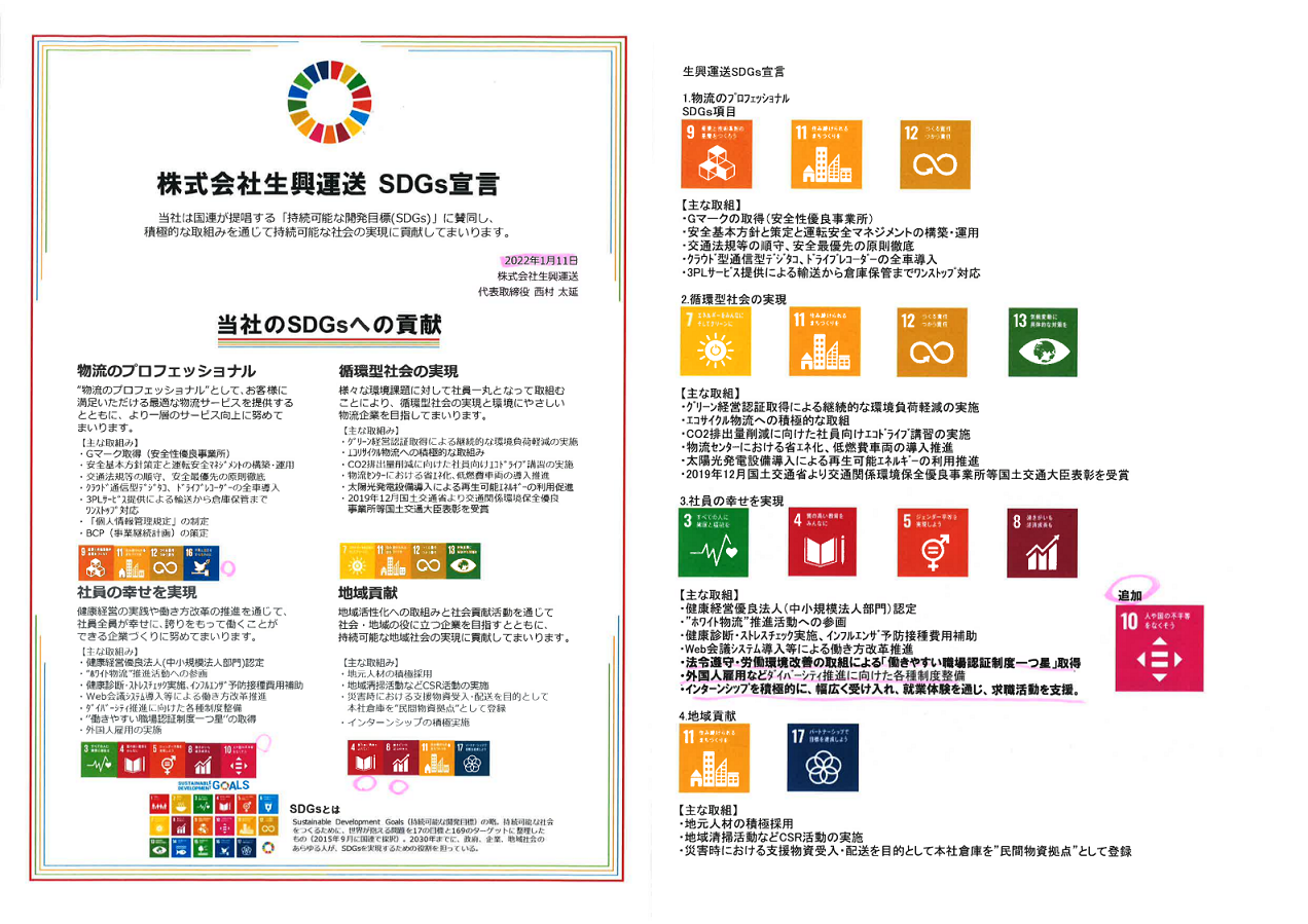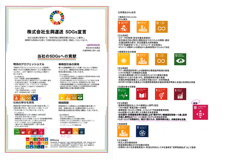 SDGsは、2021年5月20日に地元の金融機関に協力いただき宣言を行いました。2022年1月に改訂し、トラック運送事業者としては、「安全で安心な輸送サービスを提供し続けること」を社会的使命として、また、常に「安全」を最優先課題とし、環境対策とともに、産業の将来に向けて取り組んでいます。
