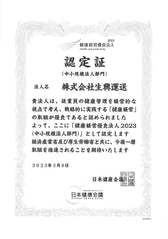 社員の幸せの実現では、健康経営優良法人(経済産業省の健康経営優良法人認定制度 (https://www.meti.go.jp/policy/mono_info_service/healthcare/kenkoukeiei_yuryouhouzin.html)を2023年も取得できましたが、継続的に2020年から取得しています。この中では、ホワイト物流の推進や、定期的な健康診断、ストレスチェックの実施や、インフルエンザ予防接種の補助を行っています。