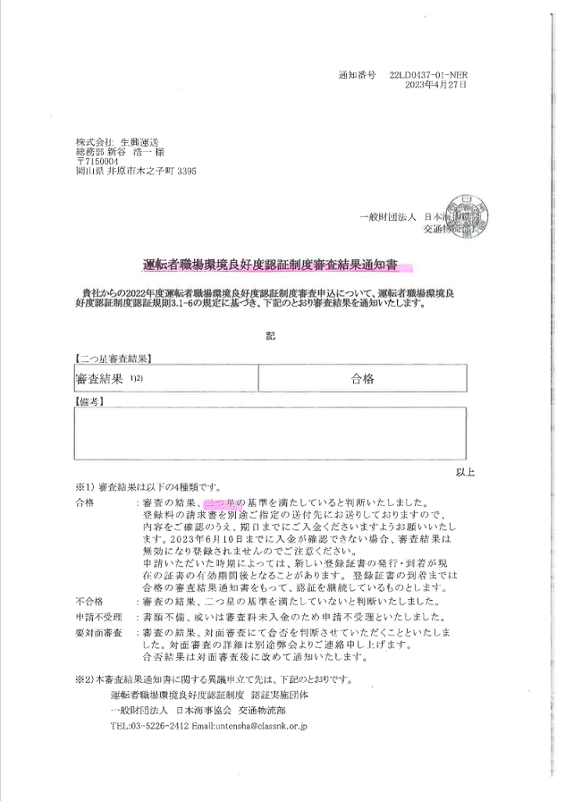 最後に、自動車運送事業者の「働きやすい職場認証制度」(https://www.untenshashokuba.jp/)が運輸局にありますが、この度2つ星を取得できました。こういった働きやすい職場認証制度を通して、社員が安心・安定して働きやすい環境を整備することに取り組んでいます。関東地区では、日本で在留資格がある外国人を採用しています。色んな知識のある人を採用していければよいと考えています。