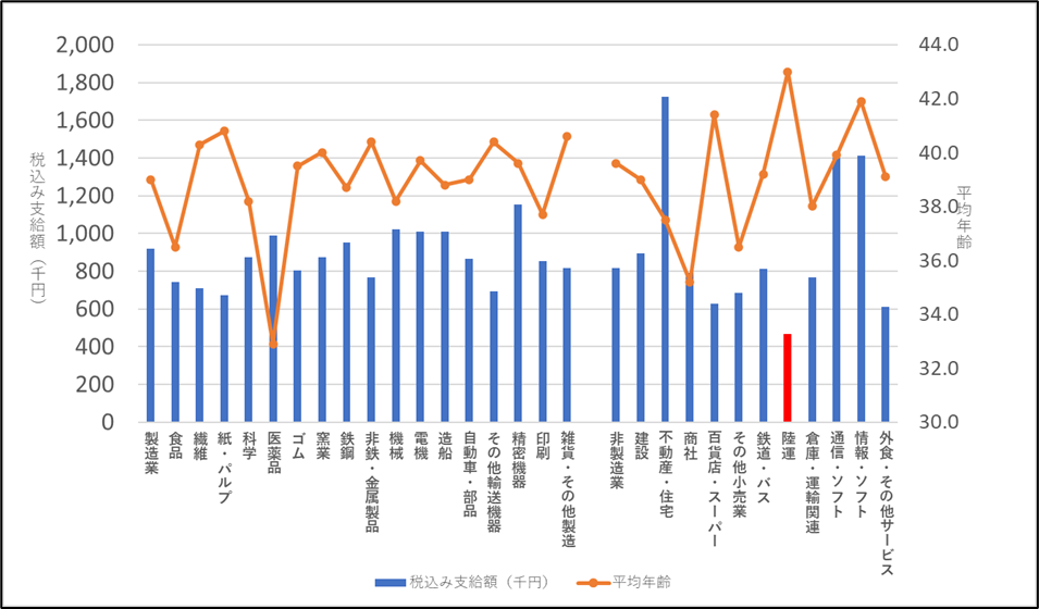 そのなかにあって突出した(?)最下位が陸運46万5千円である(赤の棒グラフ)。一方で平均年齢は全業種トップの43歳。年功序列型賃金が主流である日本の賃金構造を考えれば、平均年齢がトップで支給額が最下位の意味するところは説明するまでもない。