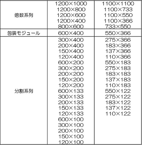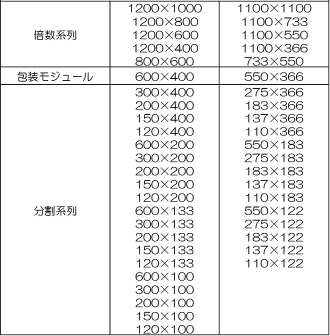 このうち、包装モジュール寸法については、図表5の通りである。図表5の包装モジュールのうち、600×400は物流モジュールの一方である1200×1000から、550×366は物流モジュールの他方である1100×1100から決められている。基準となる包装モジュールの各辺を整数倍あるいは整数分割すると、表中の各寸法が導かれる。