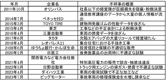 図表1 近年のコンプライアンス上の不祥事(2023年まで)