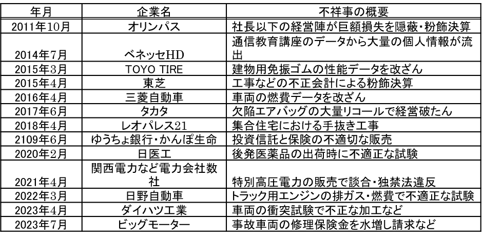 まず、新聞紙上などで報道された、近年(2023年まで)のコンプライアンス上の不祥事をご覧頂きたい。わが国を代表するような一流企業でも、毎年のように、大きな不祥事が発生している。