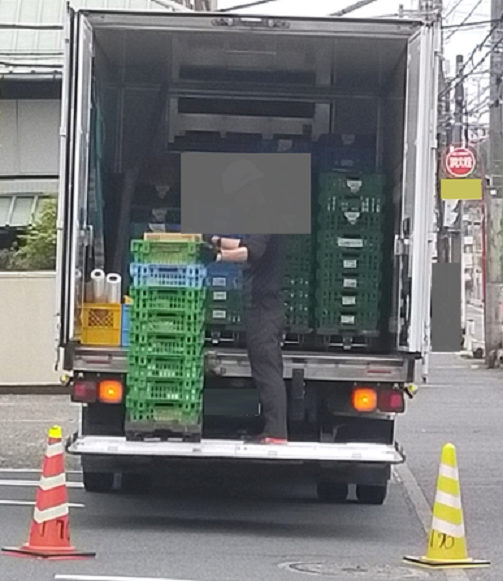 写真は、ほんの一例で、横浜市内の国道1号線沿いのスーパーマーケットへの納品車両(この場合は、荷台から下降中)である。同様の事例は商店街などでも散見されるので、一般の消費者も目にすることが多いと思う(違法行為と知らないだけ)。
