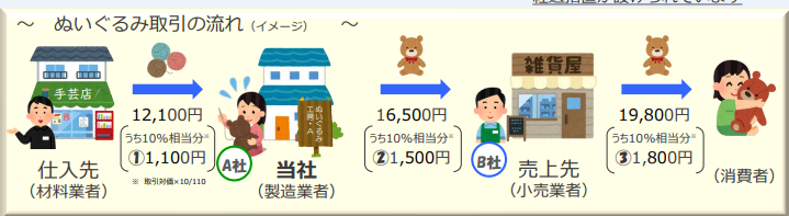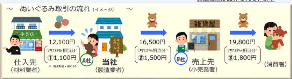図のB社は、当社(A社)が課税事業者であれば、売上消費税③の1,800円から、当社のインボイスに記載された②の1,500円を仕入税額控除した300円を消費税として納付する。