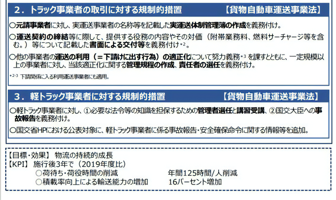 2024年4月23日に改正・可決した事業法では、トラック運送業者の取引に対する規制的措置として、以下の内容が定められた。施行は2025年4月とされている。