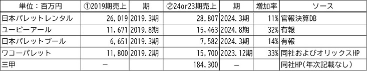 図注:パレット各社はレンタルのほかに販売等を手がけているため、また三甲はパレット以外の事業を幅広く手がけているため、レンタル以外の売上を含む。売上は単体の場合と連結の場合がある。