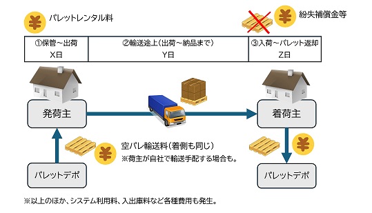 まず、空パレットの回送コストがある。自社でデポまで輸送を手配する場合を除き、発荷主が空パレットをデポから運ぶ輸送費と、逆に着荷主がデポに返却する輸送費は、誰かが負担する必要がある。