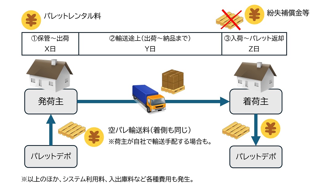 また当然のことだが、レンタル料も発生する。パレットを借りてから返すまでの日数に応じて発生するレンタル料も、荷主等が負担することになる。レンタル料は1日あたりで見れば数円程度の少額に留まる場合が多いが、貨物がパレットに載っている間、コストが発生し続けることになる。チリが積もればではないが、総額としては無視できない金額になる場合もある。