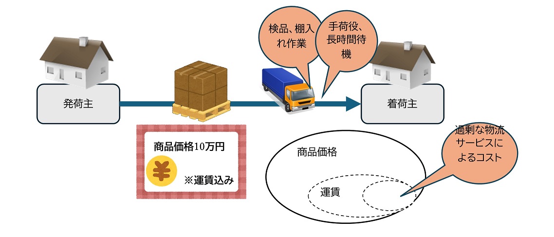 店着価格制の下では、買い手(着荷主)は明示的には運賃を負担しない。着荷主の実質的な指示で行われる手荷役や検品、棚入れ等の附帯業務のコストも、発荷主(または物流会社)が負担しているのが契約上の建て付けであり、少なくとも形式上は着荷主は負担していないことになっているのである。
