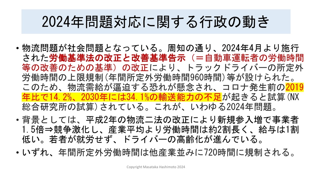 まず、2024年問題と物流効率化法に関する行政の動きについて、少しおさらいをしておきたいと思います。ご承知のように、2024年問題に関して、この4月から労働基準法と改善基準告示が改正されまして、トラックドライバーの所定外労働時間の上限規制が年間960時間に設定され、このまま続けていくと、ひとつの試算ですが、コロナ前の2019年に比べて14.2%ぐらいのものが届かなくなるということです。