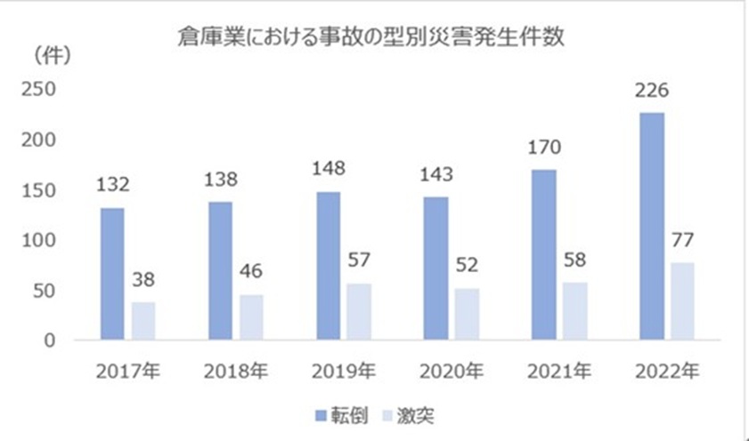 中央労働災害防止協会の「倉庫業における事故の型別労働災害発生状況(1999-2021年)」によれば、直近の2021年には休業4日以上の労働災害(職業性疾病を含む)が781件発生し、増加傾向にある(1999年は340件)。類型別にみると、動作の反動無理な動作178件、転倒170件、はさまれ巻き込まれ97件、墜落・転落96件などが多い。