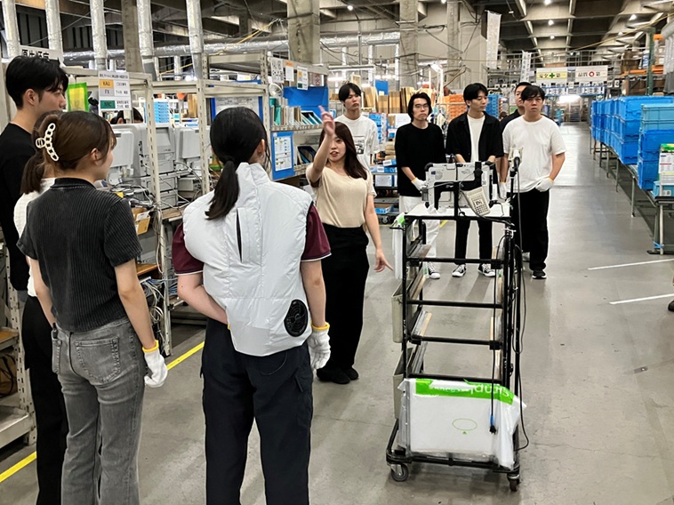 この日に見学を実施したのは、前期授業期間中唯一の補講日であり、補講には教室での出席が厳格には求められないという理由にほかならない。一方で、普段クーラーの効いた教室にいるゼミ生たちにとって、暑い盛りの物流拠点の空気も初体験であり、ゼミ生数名はKSLの計らいで空調服を試着できた。物流拠点についてはもちろん、筆者は講義で説明するし、その内側を紹介する映像資料(いわゆる「動画」)も教室で流すのであるが、このように五感で知ることの重要性を、ゼミ生たちの反応を見て改めて実感した。