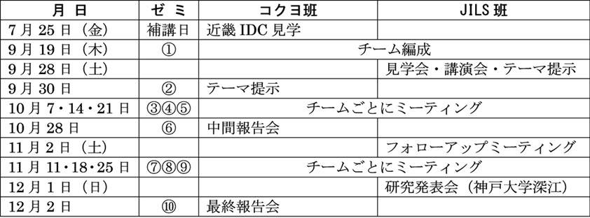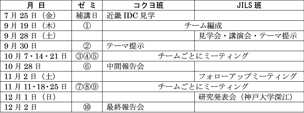 後期第1回のゼミは9月19日であり、ここでチーム編成を行った。今期は、並行して日本ロジスティクスシステム協会(JILS)関西支部の「大学合同ロジスティクス研究発表会」にもゼミとして参加することとした。表1にあるようにスケジュールがほぼ重なることとなったので、ゼミ生21名(男子16名・女子5名)を3名×7チームに再編し、5チームをKSLへの最終報告会(12月2日)を目指す「コクヨ班」、2チームを大学合同ロジスティクス研究発表会(12月1日)を目指す「JILS班」に割り当てた。