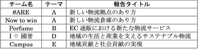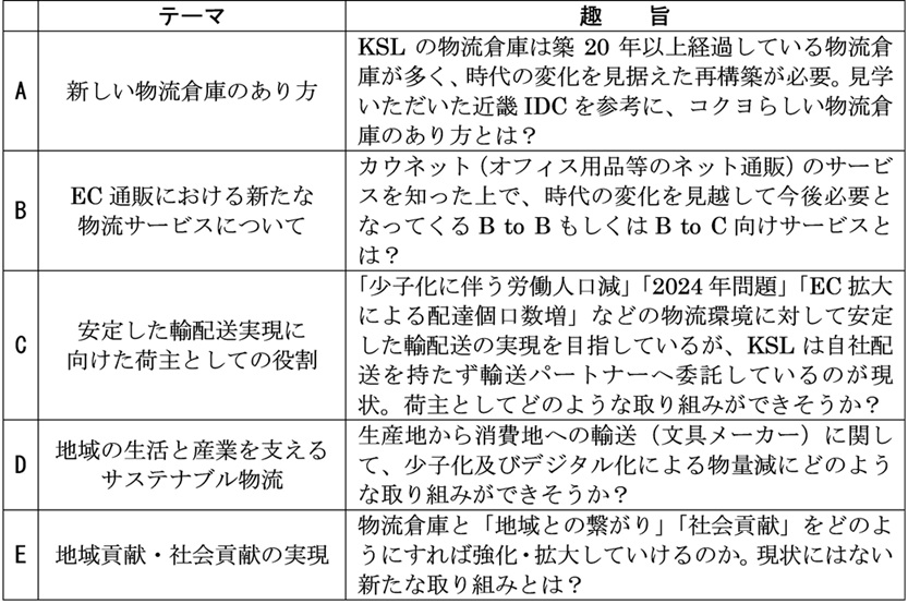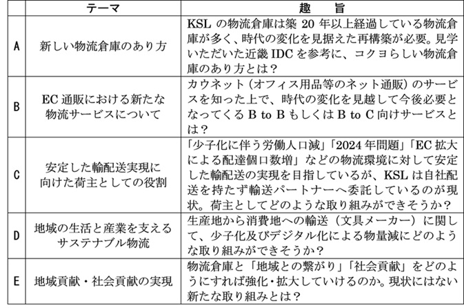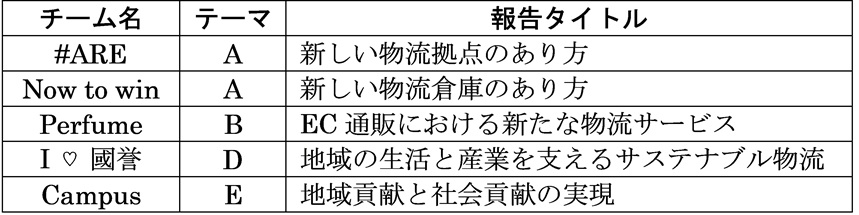 コクヨ班への研究テーマの提示は9月30日のゼミであり、表2にある5つのテーマからチームごとに選択を求めた。テーマ数とチーム数は一致したが、同じテーマを複数のチームが選択することも認めたためか、2チームがテーマAを選択し、テーマCを選択したチームはなかった。