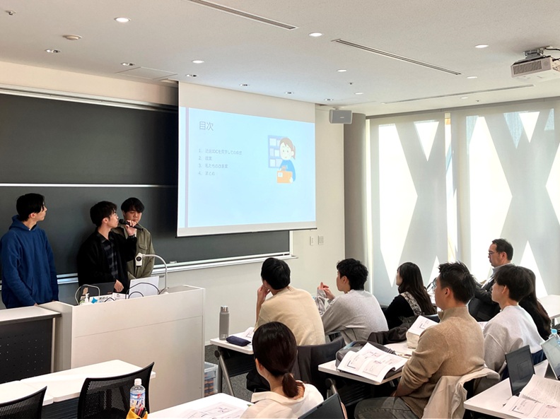 こうして、ゼミの時間帯の多くをチームミーティングに当て、筆者はアドバイスを求められた際に応じることを基本とした。筆者がやむを得ず出張し、休講した回もあったが、その際もゼミの教室を確保したところ、KSLから住野氏がご来校くださり、コクヨ班のみならずJILS班にもアドバイスしてくださった。また、最終報告会(12月2日)の直前には、ゼミ以外の時間帯でもミーティングやリハーサルの場がほしいというチームが現れ、筆者は快くゼミ教室を確保した。やはり、学外の方々をお招きして研究報告する機会には、程良い緊張感が流れるようである。