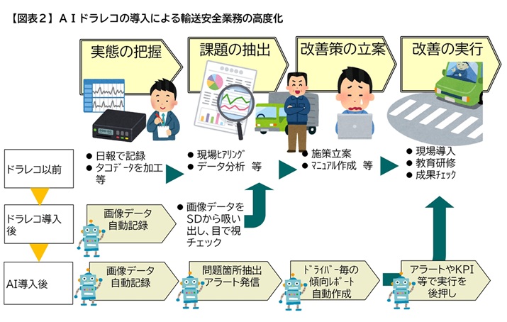 またこのような事例からは、デジタル化が遅れているとされるトラック運送業界においても、一定の条件が整えばAIソリューションが普及し得ることが分かる。AI活用の条件の一つは、上述のとおり、業務がAI活用に適合していることだが、加えて、ドライブレコーダーの映像データやデジタコのログなど、にデジタル化されたデータが容易に入手できる環境が整っていたことも重要である。