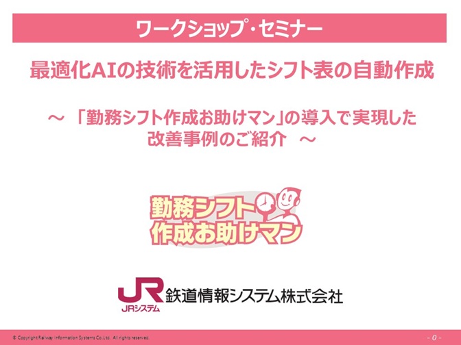 JRシステムの新井と申します、よろしくお願いいたします。我々のサービスとしては、勤務シフト表の自動作成というサービスがありますので、本日はサービス内容について、改善事例を含めてご案内できればと思います。