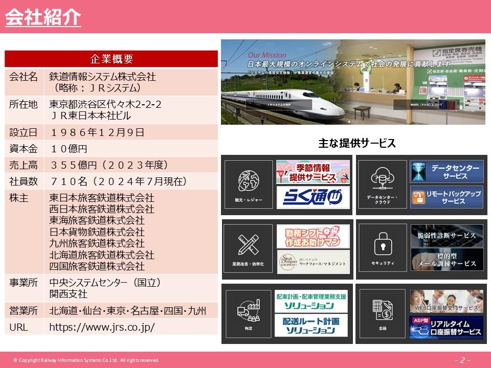 弊社の一番のコアな事業として、JRの「みどりの窓口」の座席予約のシステム(旅客販売総合システム「MARS」, https://www.jrs.co.jp/guideline/mars/)があり、こちらのシステムの開発・運用に取り組んでいます。現在その他に、JR以外のお客様に対して提供可能なサービスとして、いくつかこちらの資料の右側に記載させていただいております。