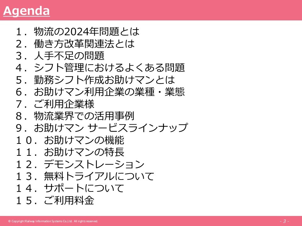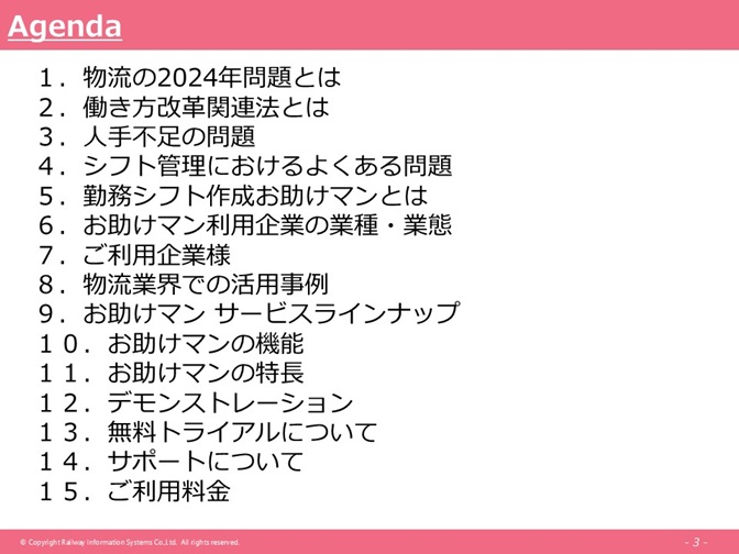 アジェンダとしてこちらに記載しています。最初に少しお話した部分もありますが、物流2024年問題とか、人手不足のお話、シフト管理に関する問題とか、そういったところで、「勤務シフト作成お助けマン」がどのようなところで使われていて、どういった改善ができたのか、そういったお話をさせていただき、最後に、(お助けマンの)デモンストレーションをできればと思っています。実際のデモを見ていただくと、機能や操作性を直感的にご理解いただけます。ぜひ最後までお付き合いいただければと思います。
