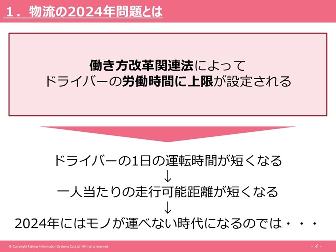 この部分は、働き方改革関連法によってドライバーの時間外労働時間の上限が設定されることが2024年問題として取り上げられていますが、それによってドライバーの1日の運転時間が短くなり、1人当たりの走行距離が減少するため、物が運べなくなるのではないか、そういった点が課題として指摘されています。