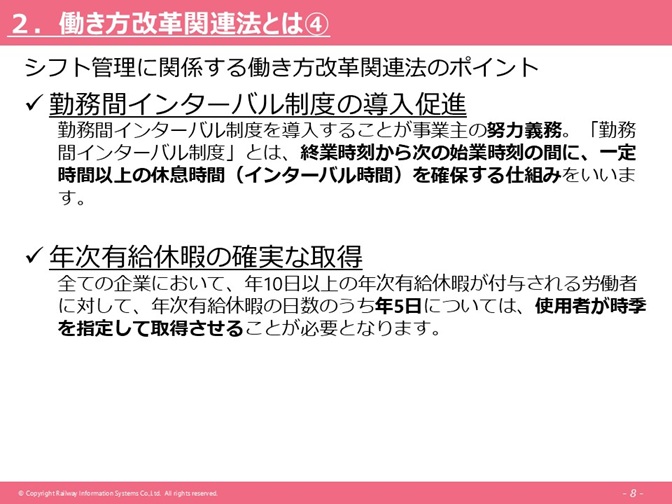 あとは物流分野とは若干異なる領域になりますが、勤務間インターバル制度の導入促進というのが、勤務シフト管理においては、非常に重要なポイントとなっています。これは努力義務として規定されていて、終業時間から次の始業時刻までの間に、一定時間以上の休憩時間を確保する仕組みの導入を求められています。こういう要素が加わると、シフト作成担当者にとっては、非常に多くのことを考えないといけないという点が一つあります。